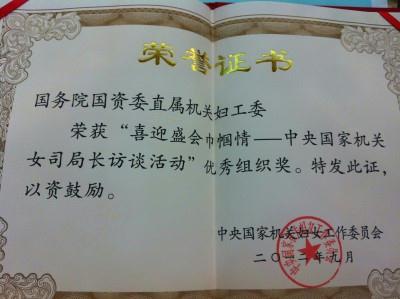 在9月28日上午召開(kāi)的“喜迎盛會(huì)巾幗情——中央國(guó)家機(jī)關(guān)女司局長(zhǎng)訪談活動(dòng)”總結(jié)會(huì)上,國(guó)資委直屬機(jī)關(guān)婦工委喜獲“中央國(guó)家機(jī)關(guān)女司局長(zhǎng)訪談活動(dòng)”優(yōu) 秀組織獎(jiǎng)。全國(guó)婦聯(lián)黨組成員、書(shū)記處書(shū)記范繼英,中央國(guó)家機(jī)關(guān)工委副書(shū)記姚志平,中央國(guó)家機(jī)關(guān)工委統(tǒng)戰(zhàn)(群工)部部長(zhǎng)談宜彥等領(lǐng)導(dǎo)同志為獲獎(jiǎng)單位頒獎(jiǎng)。國(guó) 資委直屬機(jī)關(guān)婦工委主任、巡視組副組長(zhǎng)徐華參加會(huì)議并代表國(guó)資委直屬機(jī)關(guān)婦工委領(lǐng)獎(jiǎng)。