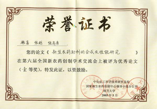 ??? 繼我院的技術研發(fā)工作于 2004年進入國家農藥攻關計劃之后,2005年又傳佳音:在第六屆全國新農藥創(chuàng)制學術交流會上,我院韓富、張越、張高勇同志撰寫的論文《新型農藥助劑的合成及性能研究》被評為優(yōu)秀論文一等獎,與上海有機所呂龍教授的論文并列獲此榮譽。會議由中化化工科技研究總院和國家南方農藥創(chuàng)制中心組辦,我院獲獎論文內容是由張高勇院士負責的國家農藥攻關專題的部分研究成果,說明我院在該領域的研究工作被農藥行業(yè)充分認可并受到關注。
