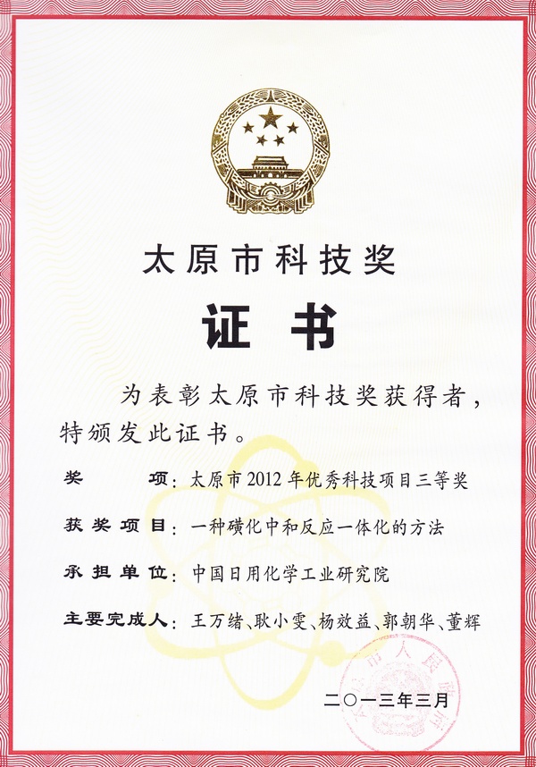 中國日化院“一種磺化中和反應(yīng)一體化的方法” 項目獲太原市優(yōu)秀科技項目三等獎