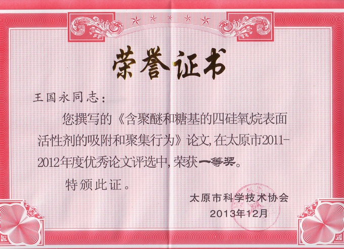 中國(guó)日化院應(yīng)用與基礎(chǔ)研究部王國(guó)永博士撰寫(xiě)的論文《含聚醚和糖基的四硅氧烷表面活性劑的吸附和聚集行為》(英文版 發(fā)表于Journal of Physical Chemistry B 2011,115(14),3811-3818)在太原市2011—2012年度優(yōu)秀論文評(píng)選中獲一等獎(jiǎng)。本次評(píng)選活動(dòng)由太原市科協(xié)組織,組委會(huì)按照申報(bào)文件要求,本著高標(biāo)準(zhǔn)、少而精,優(yōu)中選優(yōu)的原則,經(jīng)推薦、評(píng)審、審定等程序嚴(yán)格評(píng)選。全市共有357篇論文參評(píng)。