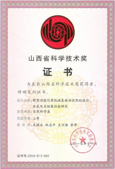 其研究成果包括:在國際上率先提出在離子液體的疏水鏈中引入短鏈支鏈硅氧烷能降低其熔點并提高其聚集能力的觀點;在國際上率先提出在糖基表面活性劑的疏水鏈中引入短鏈支鏈硅氧烷能誘導(dǎo)其形成囊泡的新觀點;構(gòu)筑了糖基有機硅表面活性囊泡體系和糖基有機硅表面活性農(nóng)藥微乳體系。自2009年以來,該小組研究成果在膠體與界面科學(xué)領(lǐng)域主流期刊如Langmuir、J. Phys. Chem. B、Colloids Surf. A和J.Ind.Eng.Chem等發(fā)表論文近三十篇,其中部分論文選為封面;在SIS、IACIS、中國化學(xué)會年會和中國化學(xué)會膠體與界面化學(xué)會議等國內(nèi)外重要會議做邀請和口頭報告13次。該成果先后榮獲第四屆亞洲膠體與界面科學(xué)會議“優(yōu)秀墻報獎”、第十七屆山西省優(yōu)秀學(xué)術(shù)論文一等獎、第十八屆山西省優(yōu)秀學(xué)術(shù)論文二等獎、2016年度山西省自然科學(xué)三等獎、2015和2017年中國日用化學(xué)品優(yōu)秀科技論文評選二等獎等獎項,其核心技術(shù)獲得三項發(fā)明專利授權(quán)。