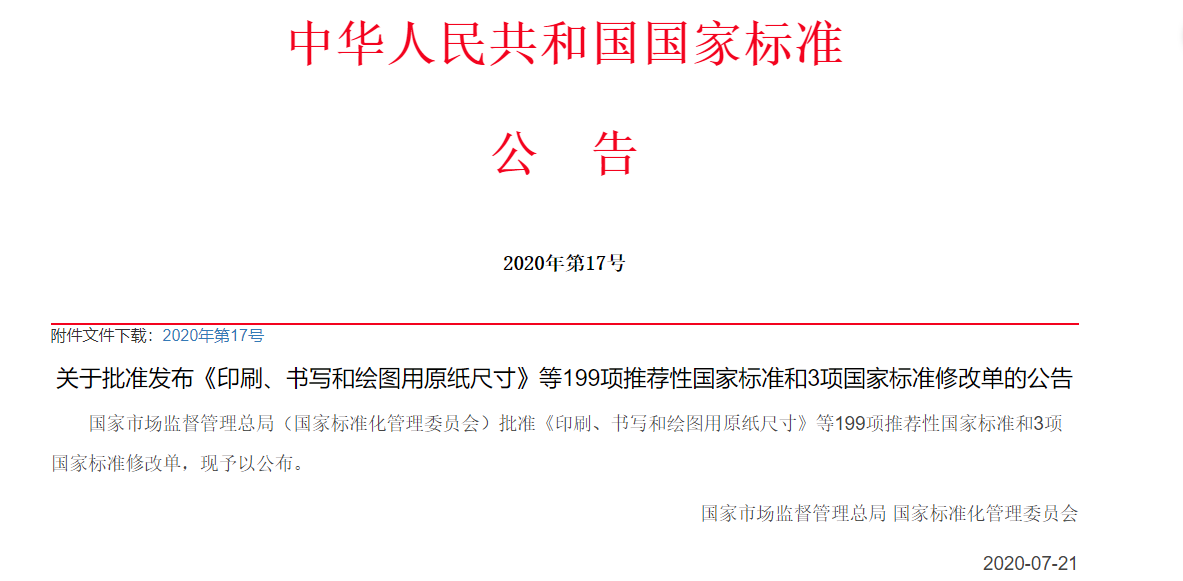 2020年7月21日,國家市場監(jiān)督管理總局、國家標(biāo)準(zhǔn)化管理委員會發(fā)布2020年第17號標(biāo)準(zhǔn)公告,批準(zhǔn)發(fā)布了199項推薦性國家標(biāo)準(zhǔn)和3項國家標(biāo)準(zhǔn)修改單。