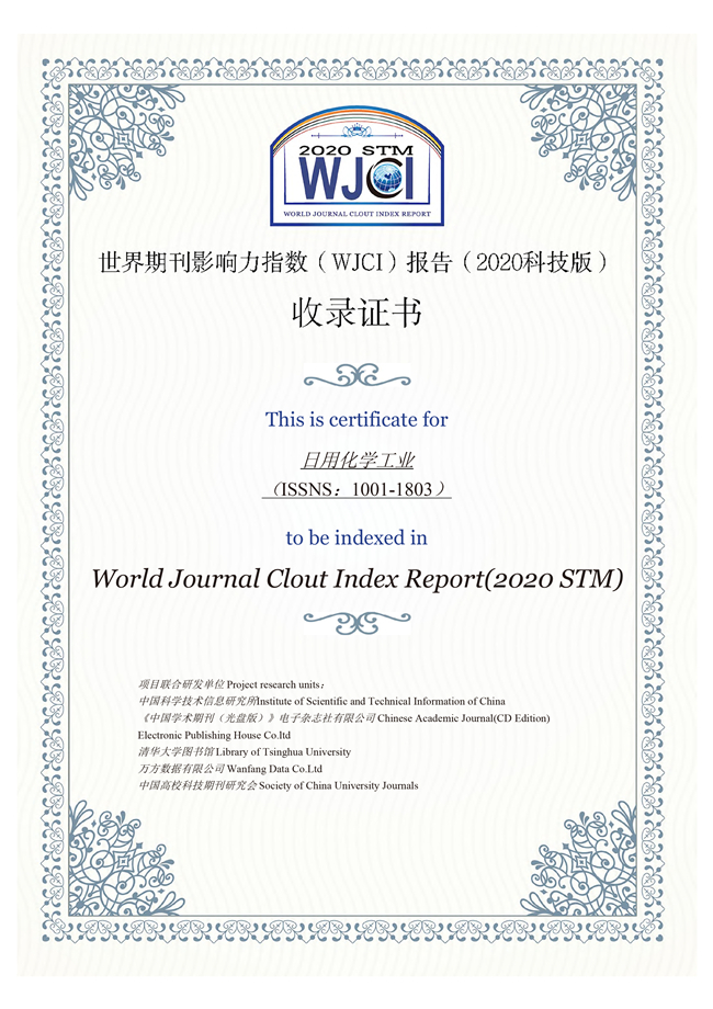 經(jīng)嚴(yán)格評議,目前《WJCI報(bào)告》共收錄全球科技期刊14287種,其中收錄中國科技期刊1426種,覆蓋246個學(xué)科?!度沼没瘜W(xué)工業(yè)》被收錄于“化學(xué)工業(yè)一般性問題”學(xué)科,本學(xué)科共收錄全球期刊42種,其中中國大陸期刊僅收錄6種,《日用化學(xué)工業(yè)》位列收錄中國大陸期刊的第4位。入選《WJCI報(bào)告》的期刊均被認(rèn)為是具有地區(qū)代表性和學(xué)科代表性的優(yōu)秀期刊,這對提升期刊的學(xué)術(shù)影響力和國際傳播力具有重要意義。