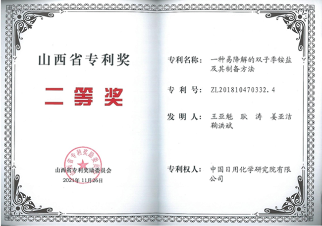 2021年11月26日,山西省專利獎勵委員會對2021年度第三屆山西省專利獎獲得者進行了表彰,中國日化院“一種易降解的雙子季銨鹽及其制備方法”(國家發(fā)明專利,專利號ZL201810470332.4)喜獲山西省專利獎二等獎,充分彰顯了日化院在促進技術(shù)創(chuàng)新和構(gòu)筑自主知識產(chǎn)權(quán)體系的核心優(yōu)勢。