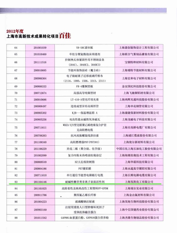 2013年8月23日下午,“2012上海市高新技術(shù)成果轉(zhuǎn)化年報發(fā)布暨上海市高新技術(shù)成果轉(zhuǎn)化百佳、自主創(chuàng)新十強項目表彰會”在上??茖W(xué)會堂隆重舉行,上海發(fā)凱化工有限公司的“耐堿性糖苷類非離子表面活性劑”項目榮獲“2012年度上海市高新技術(shù)成果轉(zhuǎn)化項目百佳”稱號。