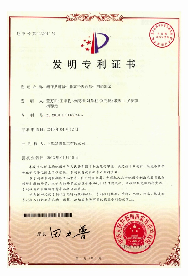 上海發(fā)凱化工有限公司依托中國日用化學(xué)工業(yè)研究院的技術(shù)優(yōu)勢,采用研究開發(fā)再創(chuàng)新,成功實現(xiàn)了“耐堿性糖苷類非離子表面活性劑產(chǎn)業(yè)化”,打破了發(fā)達國家長期以來對高端糖苷類產(chǎn)品及相關(guān)技術(shù)的封鎖和壟斷,制備出高品質(zhì)耐堿特性糖苷類系列產(chǎn)品,填補了國內(nèi)產(chǎn)業(yè)化空白?!疤擒疹惸蛪A性非離子表面活性劑的制備”技術(shù)獲得了國家發(fā)明專利授權(quán)(201010145324.6),公司生產(chǎn)的"發(fā)凱"牌、"GREENAPG PC/HC/IC"等系列烷基糖苷(APG)產(chǎn)品與國外同類品牌相比,具有很高的性價比優(yōu)勢,獲得國內(nèi)外客戶的廣泛青睞。