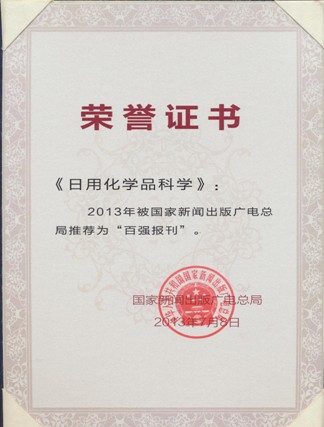 日前,由中國日用化學(xué)工業(yè)研究院主管和主辦,中國日用化學(xué)工業(yè)信息中心編輯出版的《日用化學(xué)品科學(xué)》被國家新聞出版廣電總局推選為“中國百強(qiáng)科技期刊”。