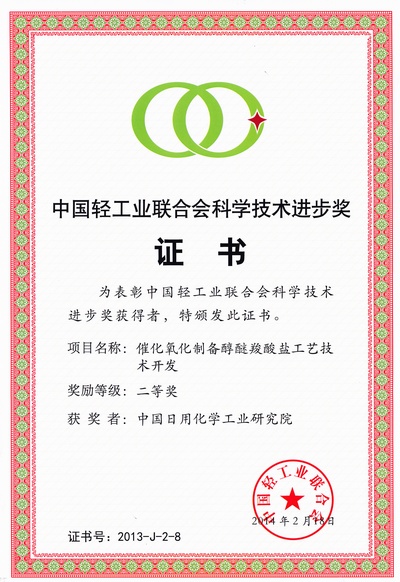 中國日化院“十一五”國家科技支撐計劃“催化氧化制備醇醚羧酸鹽工藝技術(shù)開發(fā)”項目獲中輕聯(lián)科技進步二等獎。該技術(shù)屬清潔生產(chǎn)工藝,產(chǎn)品無氯乙酸鈉殘留,更具安全性,符合國家的產(chǎn)業(yè)、技術(shù)政策,具有自主知識產(chǎn)權(quán)和明顯的創(chuàng)新性。目前該技術(shù)成果正在上海發(fā)凱化工有限公司實施產(chǎn)業(yè)化。