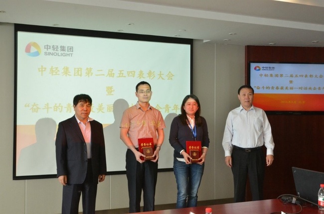 為表彰先進(jìn),樹立典型,增強(qiáng)共青團(tuán)活力和凝聚力,發(fā)揮共青團(tuán)團(tuán)員先鋒模范帶頭作用。2014年5月8日中輕集團(tuán)召開了主題為“奮斗的青春最美麗——對話央企青年”第二屆五四表彰大會(huì),我院王國永同志榮獲“中輕集團(tuán)青年五四獎(jiǎng)?wù)隆睒s譽(yù)稱號,并作為獲獎(jiǎng)代表做了“讓青春在科研一線閃光”的報(bào)告。
