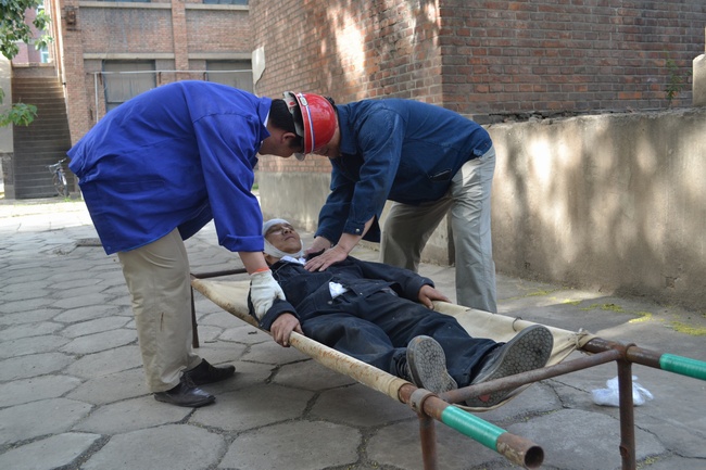 本次消防應(yīng)急預(yù)案演練分為模擬火災(zāi)和器材操作兩部分。上午9時,伴隨著一聲“不好,車間著火了”,模擬火災(zāi)演練拉開了序幕。只見車間有濃煙冒出,車間班組負(fù)責(zé)人立即一邊向預(yù)案應(yīng)急領(lǐng)導(dǎo)組報告,一邊按預(yù)案要求開展疏散、救護(hù)、初期火情控制和滅火等工作。很快,院應(yīng)急領(lǐng)導(dǎo)組帶領(lǐng)救護(hù)組、滅火組等到達(dá)現(xiàn)場,并立即加入現(xiàn)場救護(hù)和滅火等工作,同時組織職工有序通過車間通道到達(dá)安全地帶?!笆軅比藛T被迅速撤離到安全地帶,并進(jìn)行積極的救護(hù)。火源也被迅速撲滅。