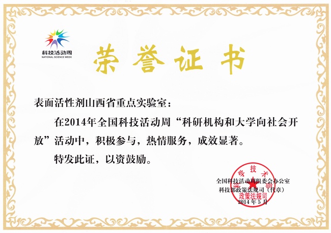 近日,我院表面活性劑山西省重點實驗室因在全國科技活動周中的突出表現(xiàn)受到科技部表彰。今年5月17至24日是全國科技活動周,主題為“科學生活 創(chuàng)新圓夢”?;顒悠陂g,山西省重點實驗室采用科普講座、趣味實驗、組織參觀等不同形式對來訪的太原理工大學現(xiàn)代學院、中醫(yī)學院附屬醫(yī)院、濱河小學及太原晚報陽光天使小記者俱樂部等4家單位共計180余人進行了表面活性劑相關(guān)知識的宣傳介紹;通過采用視頻展播、現(xiàn)場講解等方式宣傳了實驗室的發(fā)展歷史、研究方向及科研成果;通過讓到訪者親身體驗科學的魅力,達到了普及科學知識,弘揚科學精神的效果。通過本次科技活動周,重點實驗室為推動科普進程和全民科學文化素質(zhì)提高做出了努力,也擴大了自身的社會影響力。