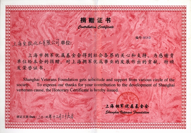 上海發(fā)凱化工有限公司在自身快速發(fā)展的同時,不忘履行企業(yè)社會責任。近日,為支持國家擁軍優(yōu)屬事業(yè),上海發(fā)凱向上海市擁軍優(yōu)屬基金會進行了捐贈,用于部隊及擁軍優(yōu)屬等文化建設。上海市金山區(qū)民政局為感謝上海發(fā)凱對擁軍優(yōu)屬事業(yè)的支持向其頒發(fā)了“捐贈證書”。