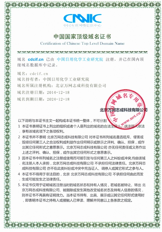 “中國日用化學(xué)工業(yè)論壇”官方網(wǎng)站www.cdcif.cn近日正式開通并上線運行,這是中國日用化學(xué)工業(yè)研究院為“中國日用化學(xué)工業(yè)論壇”的籌備和召開而專門新建的專業(yè)會議網(wǎng)站,其域名由中國日用化學(xué)工業(yè)研究院注冊和合法持有,并獲得《中國國家頂級域名證書》。