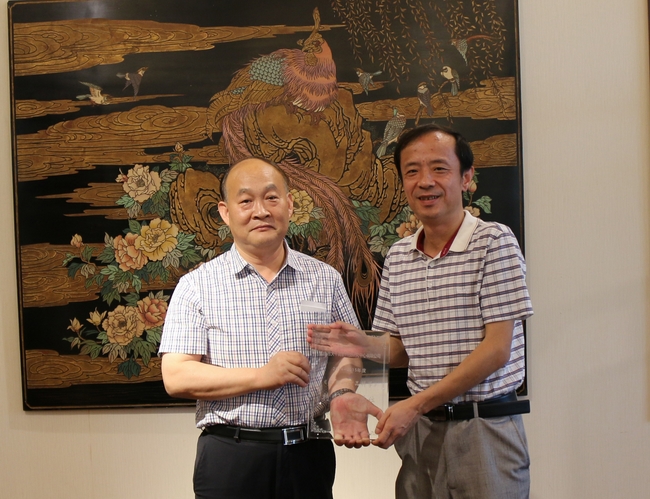 期刊總編輯王萬緒向協(xié)辦單位代表汕頭市大千高新科技研究院有限公司董事長張磊頒發(fā)期刊協(xié)辦紀(jì)念銘牌