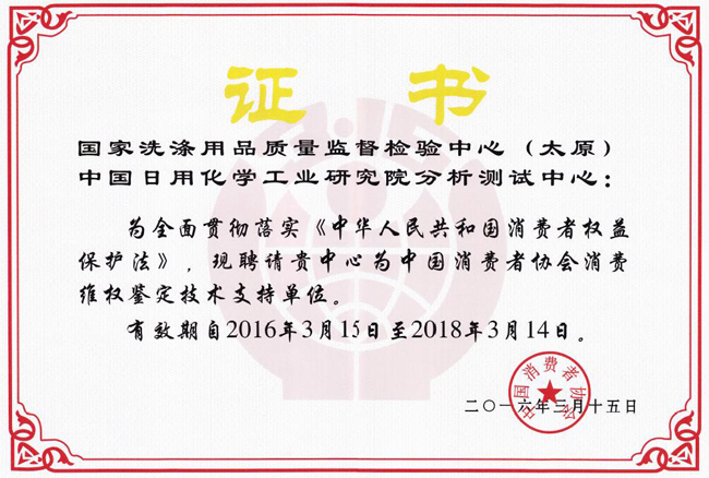 2016315日,中國消費者協(xié)會在北京舉行"新消費我做主"2016年消費維權(quán)主題活動及其發(fā)布會。中國日用化學(xué)工業(yè)研究院姚晨之同志代表國家洗滌用品質(zhì)檢中心參加會議。會議深入貫徹落實《中華人民共和國消費者權(quán)益保護法》,為此中國消費者協(xié)會特別組建了消費維權(quán)鑒定技術(shù)支持單位。首批13家質(zhì)檢機構(gòu)入選,中國日化院歸口管理的國家洗滌用品質(zhì)檢中心成為技術(shù)支持單位并獲得證書。