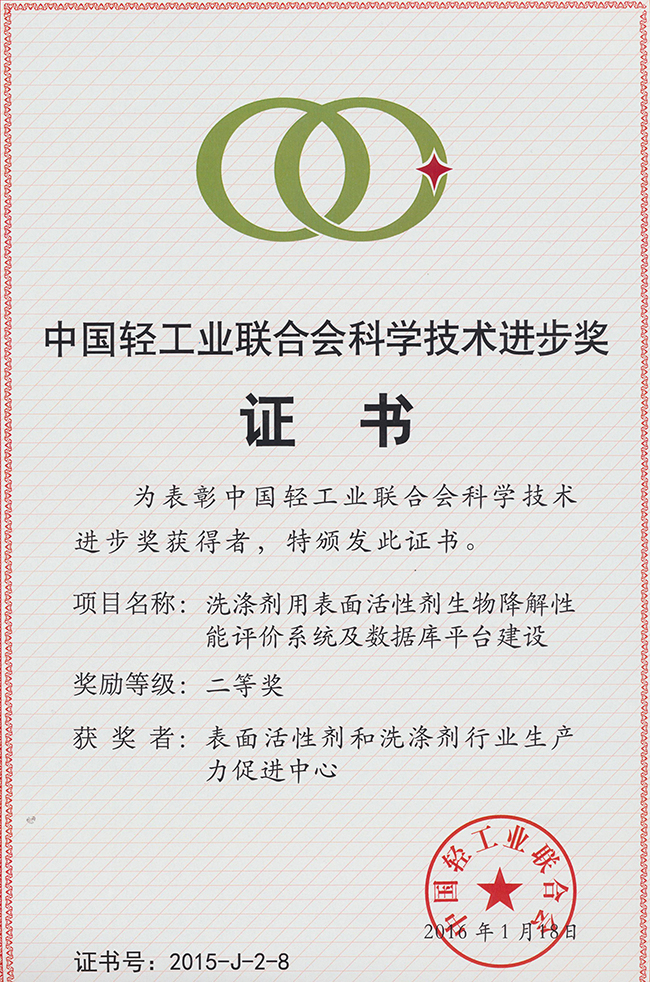 ? ? 2015年度中國輕工業(yè)聯(lián)合會科學(xué)技術(shù)獎頒獎活動于6月21日在北京舉行。此次聯(lián)合會授獎項目共144項。表面活性劑和洗滌劑行業(yè)生產(chǎn)力促進中心“洗滌劑用表面活性劑生物降解性能評價系統(tǒng)及數(shù)據(jù)庫平臺建設(shè)”獲科學(xué)技術(shù)進步二等獎;中國日化院“煙氣高效凈化濕式電除塵器及技術(shù)”獲科學(xué)技術(shù)進步三等獎。