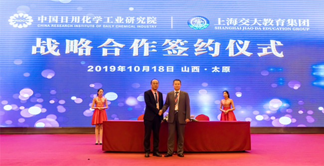 中國日用化學(xué)研究院有限公司總經(jīng)理耿濤和上海交大教育集團(tuán)總裁常韶偉出席雙方戰(zhàn)略合作簽約儀式并簽約