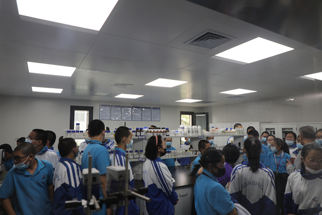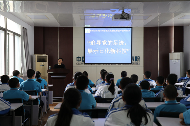 活動(dòng)期間,太原市第三十七中學(xué)近百名學(xué)生分兩批來(lái)院參觀,觀看科普展板,觀摩科研成果,參觀實(shí)驗(yàn)儀器,聽(tīng)取中國(guó)日化院應(yīng)用技術(shù)創(chuàng)新中心副主任臺(tái)秀梅博士進(jìn)行的表面活性劑知識(shí)科普講座。講座以中國(guó)共產(chǎn)黨領(lǐng)導(dǎo)的科技創(chuàng)新為主線,結(jié)合日常生活場(chǎng)景,綜述了表面活性劑基礎(chǔ)知識(shí),揭示了許多蘊(yùn)藏在生活中的科學(xué)理論;以科學(xué)家精神和對(duì)未知領(lǐng)域的不斷探索為落腳點(diǎn),激發(fā)了同學(xué)們對(duì)科學(xué)探索的興趣,幫助其樹(shù)立起投身科研自立自強(qiáng)的遠(yuǎn)大志向