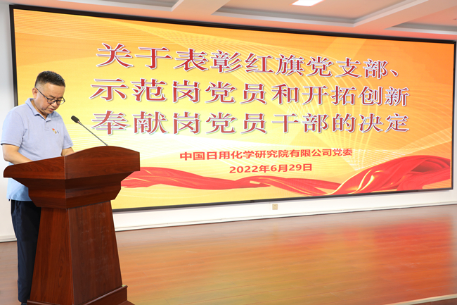 黨委書記、院長(zhǎng)耿濤為獲獎(jiǎng)黨支部、黨員干部頒獎(jiǎng)。院黨委號(hào)召獲獎(jiǎng)支部和黨員在今后的工作中不辱使命,不負(fù)眾望,發(fā)揮戰(zhàn)斗堡壘和先鋒模范的旗幟作用,和全體黨員一道帶動(dòng)全院職工為日化院改革創(chuàng)新和高質(zhì)量發(fā)展貢獻(xiàn)更高智慧和更大力量,共創(chuàng)日化院的更大輝煌。會(huì)議由中國(guó)日化院黨委委員、紀(jì)委書記張小旦主持。