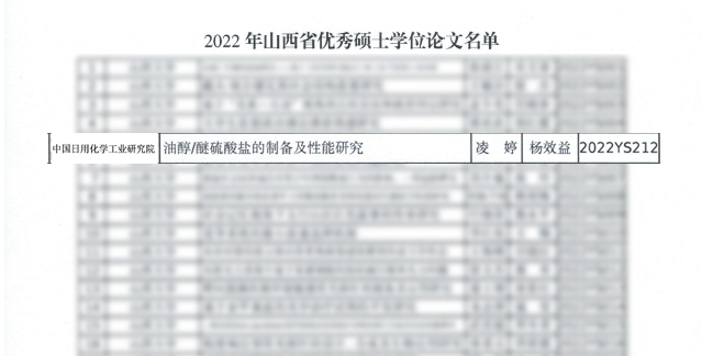 近日,山西省人民政府學(xué)位委員會(huì)辦公室公布2022年度山西省優(yōu)秀碩士學(xué)位論文,中國(guó)日化院2022屆碩士研究生凌婷撰寫(xiě)的《油醇/醚硫酸鹽的制備及性能研究》學(xué)位論文獲此項(xiàng)殊榮,該論文由楊效益正高級(jí)工程師指導(dǎo)完成。