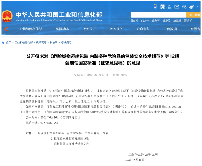 近日工業(yè)和信息化部科技司發(fā)文公開征求對《危險貨物運輸包裝 內裝多種危險品的包裝安全技術規(guī)范》等12項強制性國家標準(征求意見稿)的意見,公示截止時間為2023年8月16日。