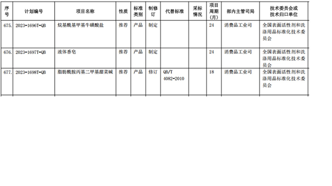 近日,工業(yè)和信息化部發(fā)布關(guān)于印發(fā)2023年第三批行業(yè)標(biāo)準(zhǔn)制修訂和外文版項(xiàng)目計(jì)劃的通知(工信廳科函〔2023〕291號)。全國表面活性劑和洗滌用品標(biāo)準(zhǔn)化技術(shù)委員會歸口的三項(xiàng)標(biāo)準(zhǔn)獲批通過。