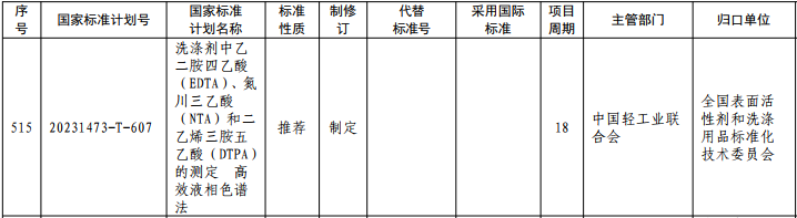 近日,《國家標(biāo)準(zhǔn)化管理委員會關(guān)于下達(dá)2023年第三批推薦性國家標(biāo)準(zhǔn)計(jì)劃及相關(guān)標(biāo)準(zhǔn)外文版計(jì)劃的通知》(國標(biāo)委發(fā)〔2023〕58號)發(fā)布。全國表面活性劑和洗滌用品標(biāo)準(zhǔn)化技術(shù)委員會歸口的《洗滌劑中乙二胺四乙酸(EDTA)、氮川三乙酸(NTA)和二乙烯三胺五乙酸(DTPA)的測定 高效液相色譜法》標(biāo)準(zhǔn)經(jīng)專家評審及公示,獲批立項(xiàng)。