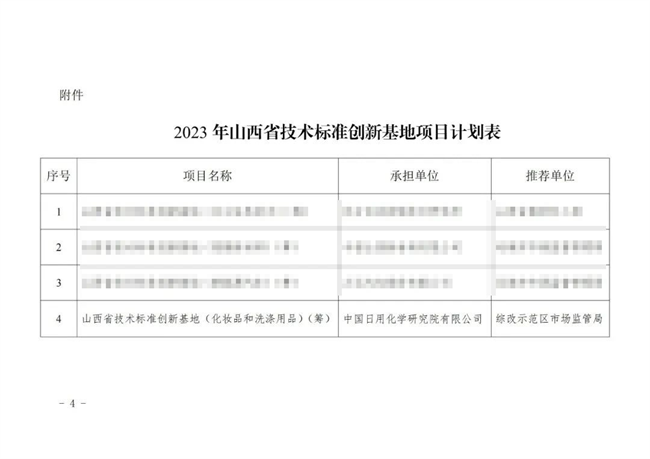 2023年12月1日,中國日用化學(xué)研究院獲批籌建山西省技術(shù)標(biāo)準(zhǔn)創(chuàng)新基地(化妝品和洗滌用品領(lǐng)域)。組織籌建技術(shù)標(biāo)準(zhǔn)創(chuàng)新基地是山西省委、省政府深入貫徹落實《國家標(biāo)準(zhǔn)化發(fā)展綱要》的重要舉措。