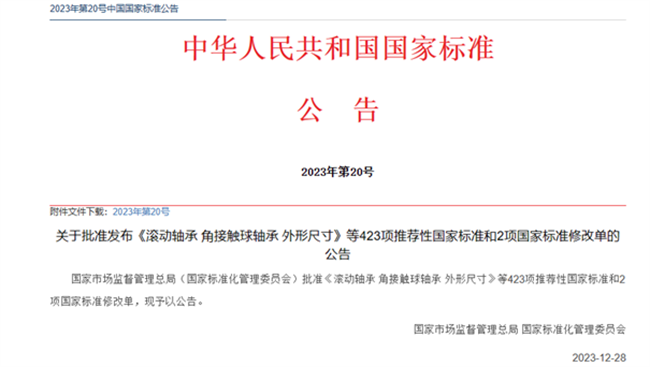 近日,國(guó)家市場(chǎng)監(jiān)督管理總局(國(guó)家標(biāo)準(zhǔn)化管理委員會(huì))發(fā)布《關(guān)于批準(zhǔn)發(fā)布<滾動(dòng)軸承 角接觸球軸承 外形尺寸>等423項(xiàng)推薦性國(guó)家標(biāo)準(zhǔn)和2項(xiàng)國(guó)家標(biāo)準(zhǔn)修改單的公告》(2023年第20號(hào))。