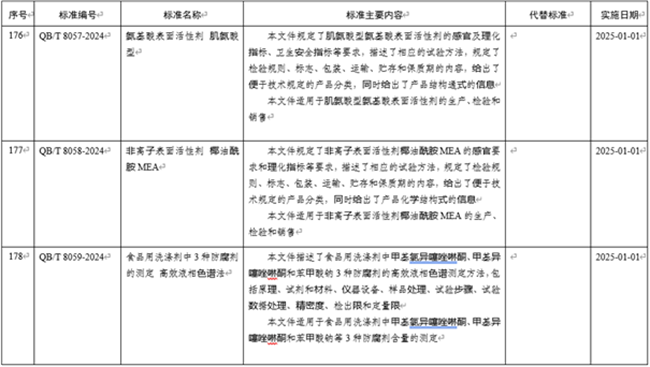 日前,國(guó)家工業(yè)和信息化部發(fā)布2024年第18號(hào)公告,批準(zhǔn)發(fā)布《智慧家庭 健康管理 智能康復(fù)服務(wù)產(chǎn)品接口技術(shù)要求》等554項(xiàng)行業(yè)標(biāo)準(zhǔn),其中由全國(guó)表面活性劑和洗滌用品標(biāo)準(zhǔn)化技術(shù)委員會(huì)(SAC/TC 272)歸口管理的有QB/T 8054-2024《磺化企業(yè)安全生產(chǎn)技術(shù)規(guī)范》等5項(xiàng),由全國(guó)食品用洗滌消毒產(chǎn)品標(biāo)準(zhǔn)化技術(shù)委員會(huì)(SAC/TC 395)歸口管理的1項(xiàng),QB/T 8059-2024《食品用洗滌劑中3種防腐劑的測(cè)定 高效液相色譜法》,詳見下表。