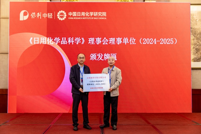 主持會(huì)議期間,《日用化學(xué)品科學(xué)》總編、中國(guó)日用化學(xué)研究院院長(zhǎng)耿濤向《日用化學(xué)品科學(xué)》理事會(huì)理事單位(2024-2025)頒發(fā)牌匾?!度沼没瘜W(xué)品科學(xué)》主編、中國(guó)日用化學(xué)研究院副院長(zhǎng)程寧向《日用化學(xué)品科學(xué)》編委頒發(fā)證書。