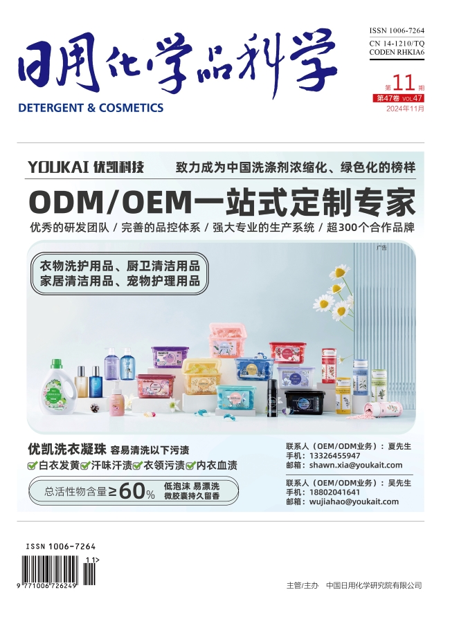 《日用化學(xué)品科學(xué)》(CN:14-1210/TQ,ISSN:1006-7264,月刊)由中國日用化學(xué)研究院有限公司主管和主辦。作為國內(nèi)日化行業(yè)具有引領(lǐng)力、專業(yè)深耕行業(yè)60余年的學(xué)術(shù)載體,具有獨特的權(quán)威性和影響力。