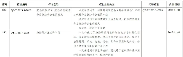 上述兩項(xiàng)標(biāo)準(zhǔn)于2025年11月1日起實(shí)施,分別更新完善了肥皂試驗(yàn)方法,建立了洗滌用纖維素酶制劑產(chǎn)品標(biāo)準(zhǔn),進(jìn)一步提升了家用化學(xué)品標(biāo)準(zhǔn)體系的實(shí)用性和科學(xué)性。